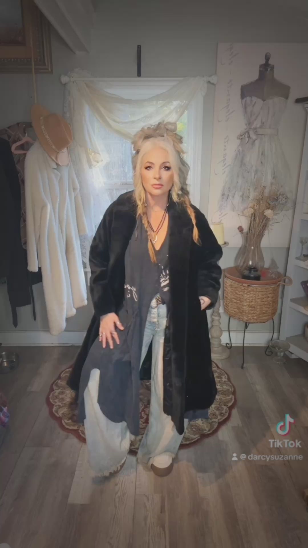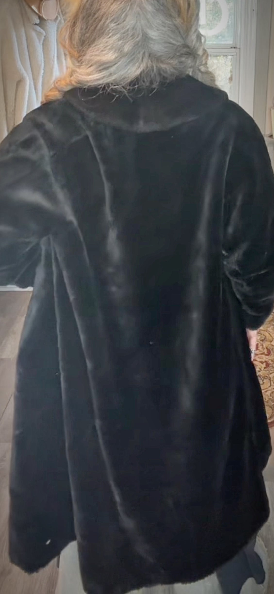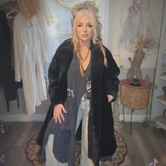 This is a vintage treasure I found while in Winston-Salem gorgeous long photo for black coat with a beautiful satin interior size seems to be medium large. Very warm super cute for that mob wife aesthetic. I love pairing it with a pair of white leg jeans and tennis shoes this is the only one like this. I haveplease email me with any questions.